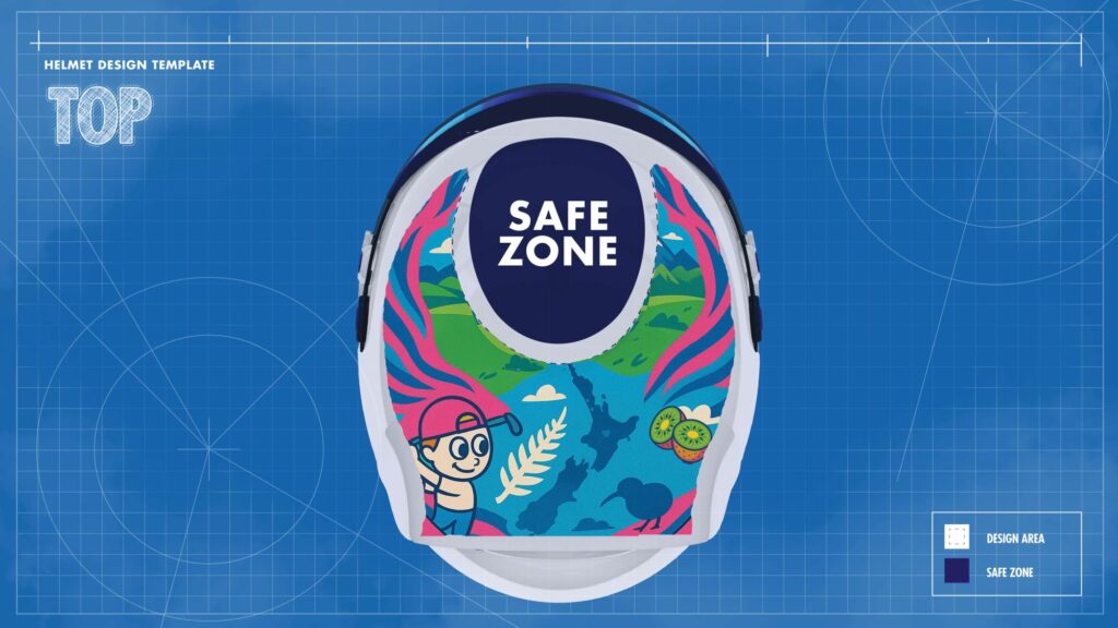 “I settled on pink, blue, and white as the main colours, since Liam often uses them on his helmets. I started picturing a kiwi bird in a pink backwards cap driving a golf cart. I wanted a fun, cartoon-like style, that evolved into something more layered, with elements like ferns, rolling hills, clouds, kiwi fruit, and the shape of New Zealand.”