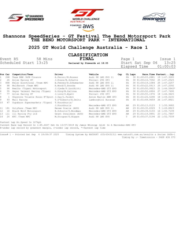 GT World Challenge Australia powered by AWS’ visit to GT Festival The Bend continues tomorrow with Race 2 at 2:10pm ACST, which is preceded by a Free Grid Walk for attending fans at 1:40pm ACST.