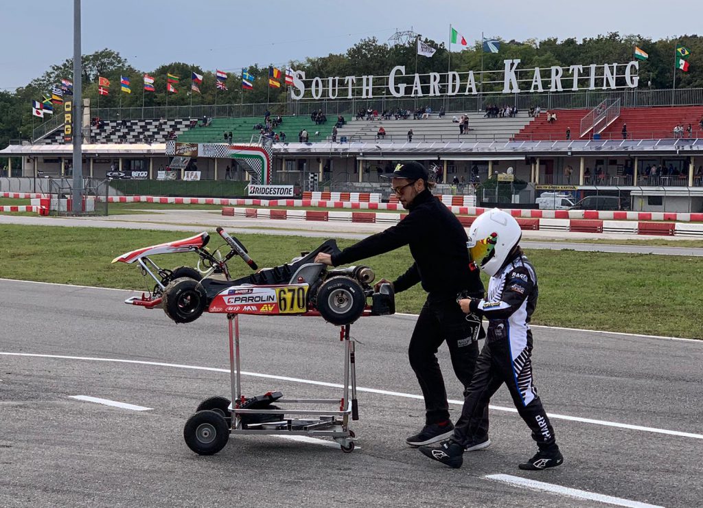 He started strongly, fastest in the very first test session in mixed wet/dry track conditions, impressing the Italian team, Parolin AV Racing, which was running his kart for these two Italian events. In later sessions on a dry, super grippy track, he was within the top ten in terms of lap times. Engine issues hampered the second day of testing, but Sharp used his braking and passing skills to best advantage.