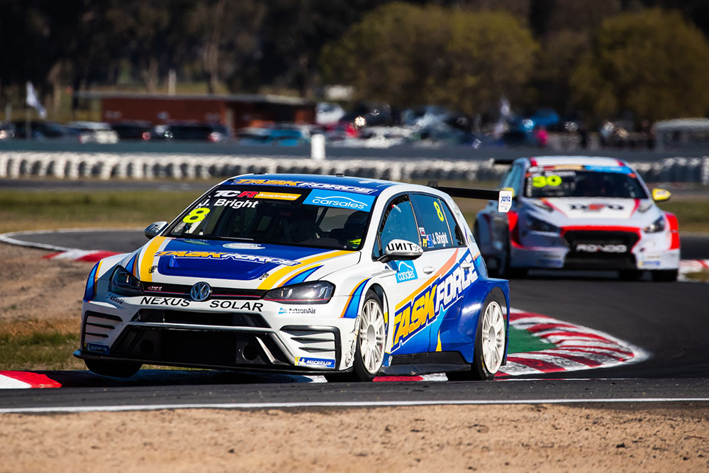 Race 1 winner Jason Bright and Aaron Cameron shared the seconds from the Sunday stoushes in Volkswagen Golfs, with veteran Russell Ingall moving up steadily and stealthily through the weekend for the final podium place in Race 3 with an Audi RS3.