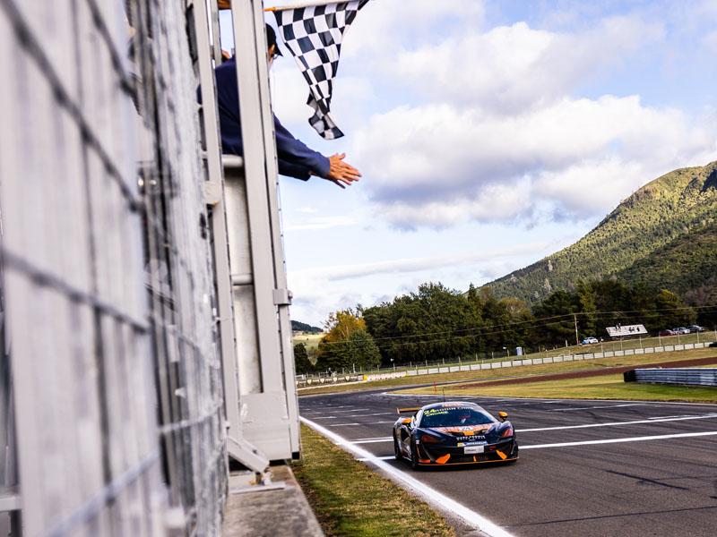 Connor Adam (main photo) has crossed the line in first place in the opening race of the weekend in the Rodin Cars Super GT Series at Taupo this afternoon, with McLaren racer Nigel Cromie taking the win in the GT4 class.