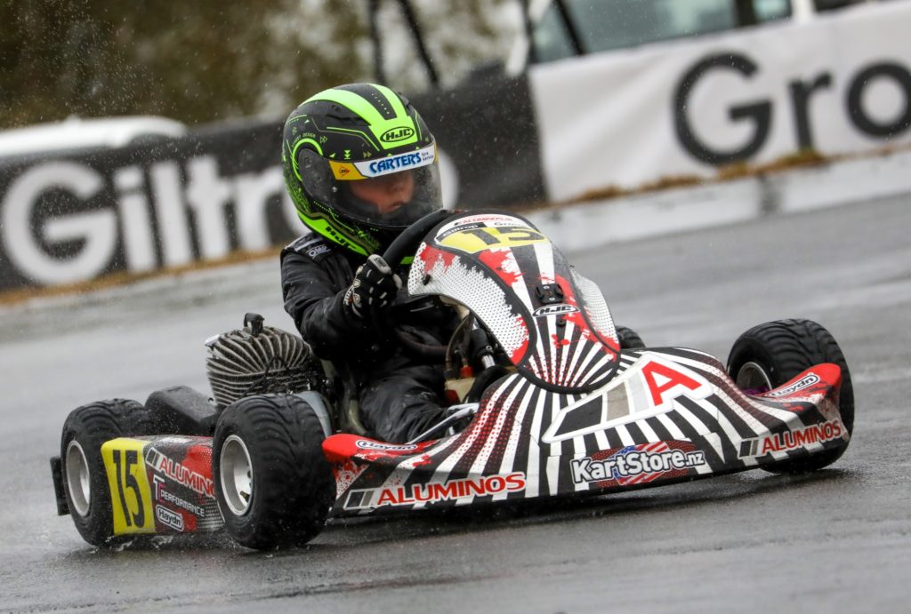Douglas in particular was imperious in both his Pre-Final ad Final races jumping into an early lead in both before putting in an a master class in handling the streaming wet track conditions as rain showers swept across the KartSport Canterbury club’s track at Carrs Rd in Halswell.