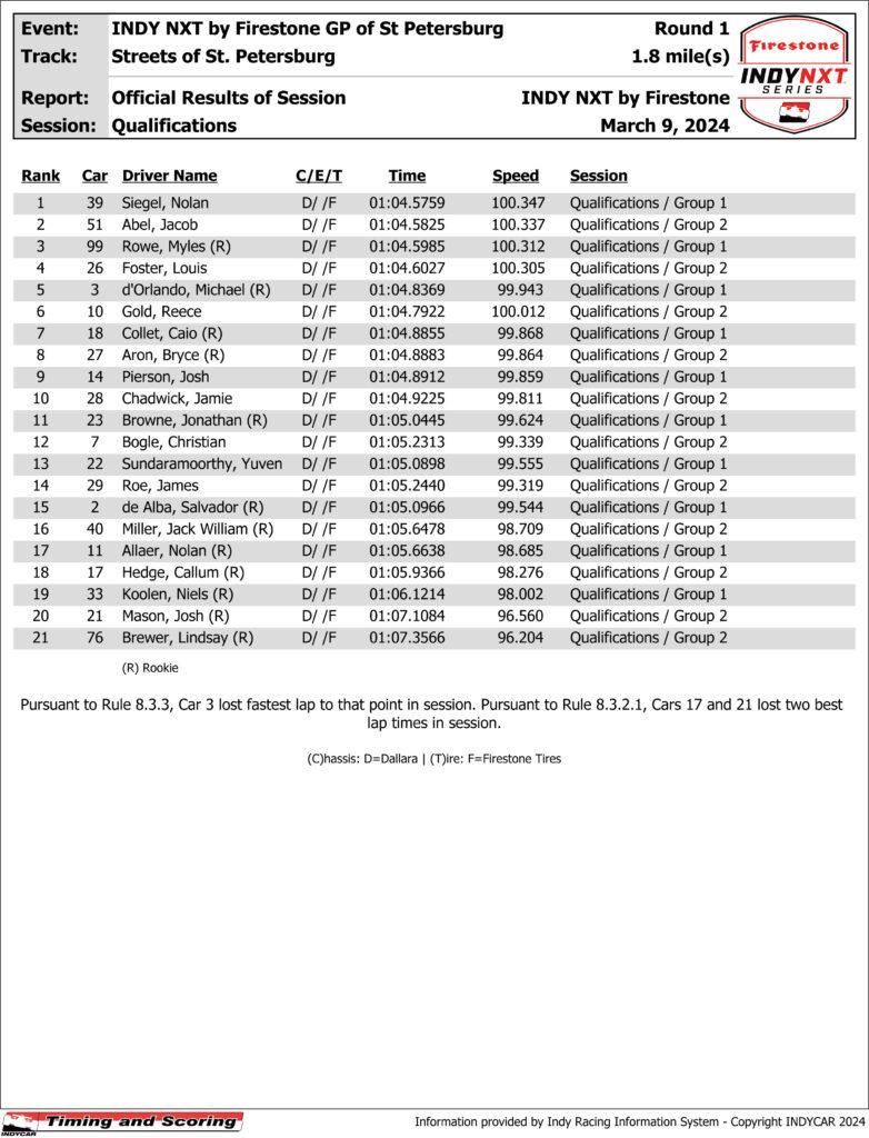 New for this year, INDY NXT by Firestone competitors were divided into two qualifying groups, and Siegel’s group ran without a caution. The second group had two red flags, including one when the field was on what presumably would have been the fastest laps. That group came up a few tenths short of Siegel’s pace-setting time. Kiwi Callum Hedge, in the second qualifying group, set the 18th fastest time.