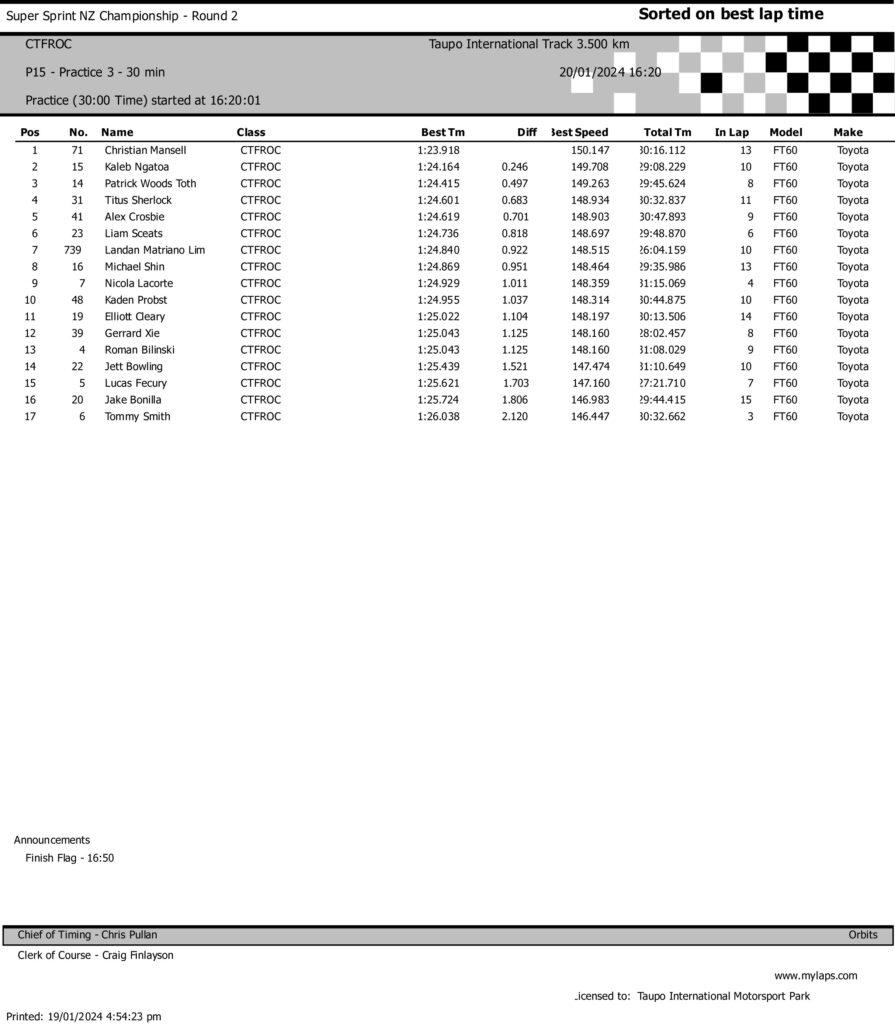 The third and final session of the day – which included a minor earth tremor in a region notorious for tectonic activity – saw Mansell fastest again in dry but slightly slower conditions. His nearest challengers were Woods-Toth and Ngatoa again, pointing at least at this stage to those three being contenders over the forthcoming weekend.