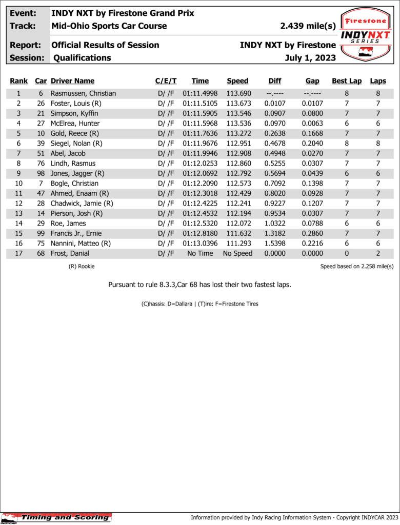 INDY NXT by Firestone Grand Prix at Mid-Ohio Qualifying Results