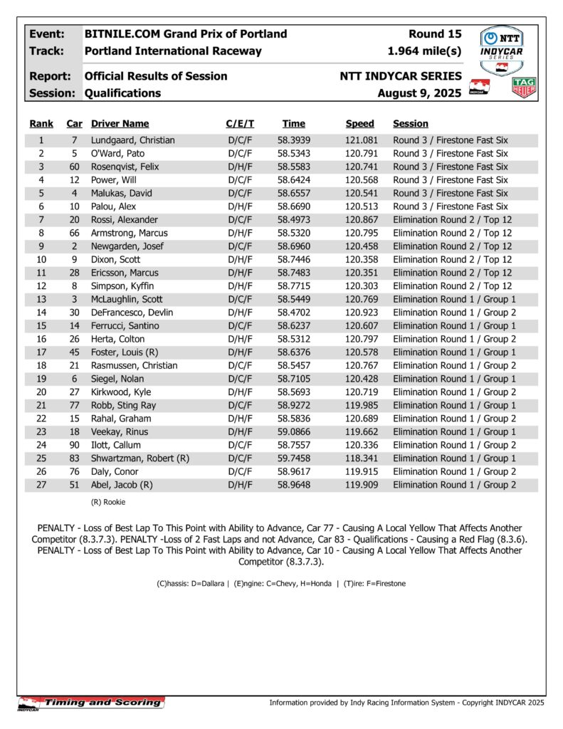 Starting third will be reigning Portland winner Will Power, who stopped the clocks at 58.6424 in the No. 12 Verizon Team Penske Chevrolet. David Malukas will start fourth after his lap of 58.6557 in the No. 4 Gallagher Insurance Chevrolet of A.J. Foyt Enterprises.